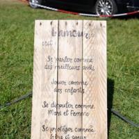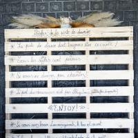 Louez cette palette en bois vernie, sur laquelle des règles d'amusement pour la piste de danse sont inscrites en lettres manuscrites. Idéale pour encourager vos invités à s'amuser tout en respectant l'esprit festif, elle apporte une touche conviviale et ludique à votre événement.