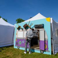 Louez ce décor fait main, parfait pour dissimuler une tonnelle ou servir de brise-vue avec une touche de style Peace and Love. Ce panneau représente un vieux van VW chargé de chaises et d'une valise sur le toit, pour un look vintage et amusant.