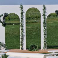 Élevez l'élégance de votre événement extérieur avec ce décor en panneaux blancs sur support bois, conçu pour créer un cadre enchanteur pour les prises de photos. Les trois panneaux majestueux, de 2m50 de haut sur 1m20 de large chacun, sont ornés de portes arrondies qui laissent entrevoir le paysage derrière, ajoutant une touche de mystère et de raffinement. Avec ses 4 m de large sur 1m10 de profondeur, ce décor impressionnant apporte une dimension spectaculaire à tout événement.