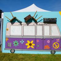 Louez ce décor fait main, parfait pour dissimuler une tonnelle ou servir de brise-vue avec une touche de style Peace and Love. Ce panneau représente un vieux van VW chargé de chaises et d'une valise sur le toit, pour un look vintage et amusant.